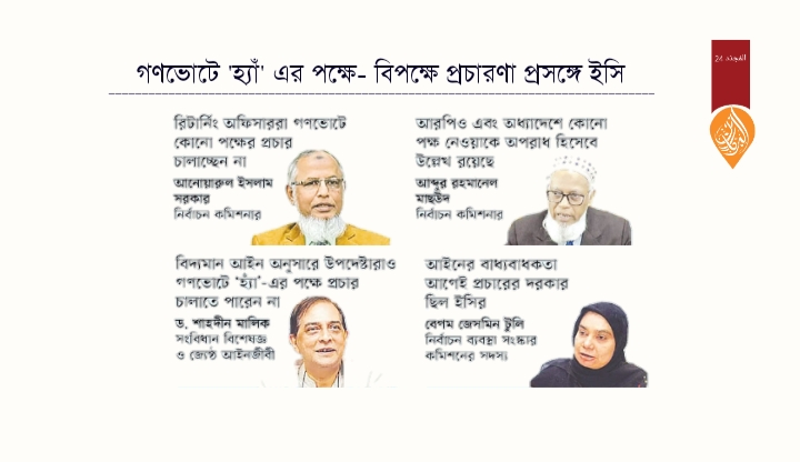 সরকারি প্রতিষ্ঠান ও কর্মকর্তাদের মাধ্যমে ‘হ্যাঁ’-এর পক্ষে প্রচারণা চালানো কতটা আইনসংগত—এ প্রশ্নে তিনি মন্তব্য করতে অপারগতা প্রকাশ করেন। তবে তিনি বলেন, নির্বাচন কমিশন একটি সাংবিধানিক প্রতিষ্ঠান হিসেবে স্বাধীনভাবে কাজ করছে। সরকারি প্রচারণা ও পাল্টা দাবিএদিকে নির্বাচন কমিশনের এই অবস্থানের বিপরীতে সরকারি বিভিন্ন প্রতিষ্ঠান ও সরকারি ভবনে ‘হ্যাঁ’-এর পক্ষে ব্যানার, ফেস্টুন ও বিলবোর্ড দেখা যাচ্ছে। উপদেষ্টা পরিষদের পক্ষ থেকে দাবি করা হচ্ছে—গণভোটে ‘হ্যাঁ’-এর পক্ষে প্রচারণায় সরকারিকর্মকর্তাদের কোনো আইনগত বাধা নেই।তাঁদের যুক্তি হলো—বিদ্যমান সংবিধান, আরপিও, জুলাই জাতীয় সনদ বাস্তবায়ন আদেশ ২০২৫ কিংবা গণভোট অধ্যাদেশে কোথাও বলা নেই যে সরকারি কর্মকর্তা-কর্মচারীরা ইতিবাচকপরিবর্তনের পক্ষে কথা বলতে পারবেন না। আন্তর্জাতিকভাবে বিভিন্ন দেশে গণভোটে সরকার ‘হ্যাঁ’ ভোটের পক্ষে প্রচারণা চালিয়েছে—এটি নৈতিক ও গ্রহণযোগ্য বলেও দাবি করা হয়।বিশেষজ্ঞদের মতামতসংবিধান বিশেষজ্ঞ ও সুপ্রিম কোর্টের জ্যেষ্ঠ আইনজীবী ড. শাহদীন মালিক বলেন, বিদ্যমান আইন অনুযায়ী অন্তর্বর্তী সরকারের উপদেষ্টারাও গণভোটে ‘হ্যাঁ’-এর পক্ষে প্রচার চালাতে পারেন না। কারণ তাঁরা প্রজাতন্ত্রের কাঠামোর বাইরের কেউ নন। সরকারি কর্মকর্তা-কর্মচারীদের জন্য যে বিধি-নিষেধ প্রযোজ্য, তা উপদেষ্টাদের ক্ষেত্রেও প্রযোজ্য হওয়া উচিত।