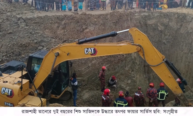রাজশাহীর তানোরে গভীর নলকূপের পরিত্যক্ত গর্তে পড়ে যাওয়া দুই বছরের শিশু সাজিদকে এখনও উদ্ধার করা সম্ভব হয়নি। দীর্ঘ ১৯ ঘণ্টা পেরিয়ে গেলেও তার অবস্থান নিশ্চিত করতে পারেনি ফায়ার সার্ভিস। বৃহস্পতিবার (১১ ডিসেম্বর) সকাল থেকে ফায়ার সার্ভিসের উদ্ধারকর্মীরা গর্তের দিকে সুরঙ্গ খনন শুরু করেন, তবে এখনো শিশুটিকে খুঁজে পাওয়া যায়নি। বুধবার (১০ ডিসেম্বর) দুপুর ১টার দিকে উপজেলার কোয়েলহাট পূর্বপাড়া এলাকায় ধানের খড়ের মাঠে মায়ের সঙ্গে থাকা অবস্থায় ছোট্ট সাজিদ হঠাৎ প্রায় ৪০ ফুট গভীর ও সরু একটি গর্তে পড়ে যায়। গর্তটির ব্যাস ছিল মাত্র ৮ ইঞ্চি, যা উদ্ধারকর্মীদের জন্য বড় চ্যালেঞ্জ তৈরি করেছে। ঘটনার পরপরই ফায়ার সার্ভিসের পাঁচটি ইউনিট সেখানে পৌঁছে উদ্ধার অভিযান শুরু করে। কিন্তু গর্তের গভীরতা ও সরু ব্যাসের কারণে প্রচলিত পদ্ধতিতে উদ্ধার কঠিন হয়ে পড়ে। উদ্ধারকাজে ব্যবহার করার জন্য একটি উচ্চক্ষমতাসম্পন্ন এক্সকেভেটর প্রয়োজন হলেও তানোর উপজেলায় কোনো উপযুক্ত মেশিন পাওয়া যায়নি। দিনের পর রাত পেরিয়ে অবশেষে রাত ৮টার দিকে পাশের মোহনপুর উপজেলা থেকে দুটি ছোট এক্সকেভেটর আনা হয়। পরে ফায়ার সার্ভিস সদস্যরা মাটি খনন করে বিকল্প একটি গভীর গর্ত তৈরি করতে শুরু করেন। বৃহস্পতিবার ভোর ৬টার দিকে নতুন গর্তের খনন কাজ শেষ হয়। এরপর সেখান থেকে শিশুটি যে গর্তে পড়ে গেছে সেই দিকে সুরঙ্গ খনন শুরু হয়। প্রায় দেড় ঘণ্টা ধরে সেই কাজ চললেও শিশুটির দেখা মেলেনি।তানোর ফায়ার সার্ভিসের স্টেশন ম্যানেজার আব্দুর রউফ জানান, “আমরা প্রায় ৪০ ফুট পর্যন্ত খনন করেছি এবং সেখান থেকে আরেকটি সুরঙ্গ করে শিশুটির কাছে পৌঁছানোর চেষ্টা চলছে। তাকে পাওয়া না পর্যন্ত আমাদের উদ্ধার তৎপরতা অব্যাহত থাকবে।”